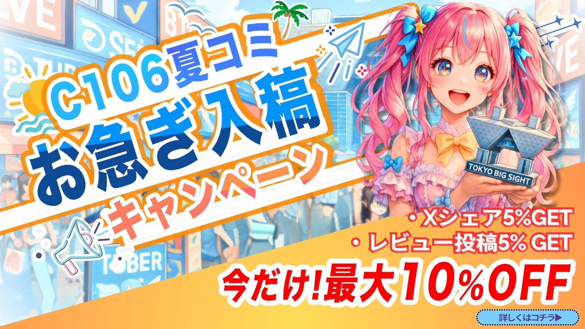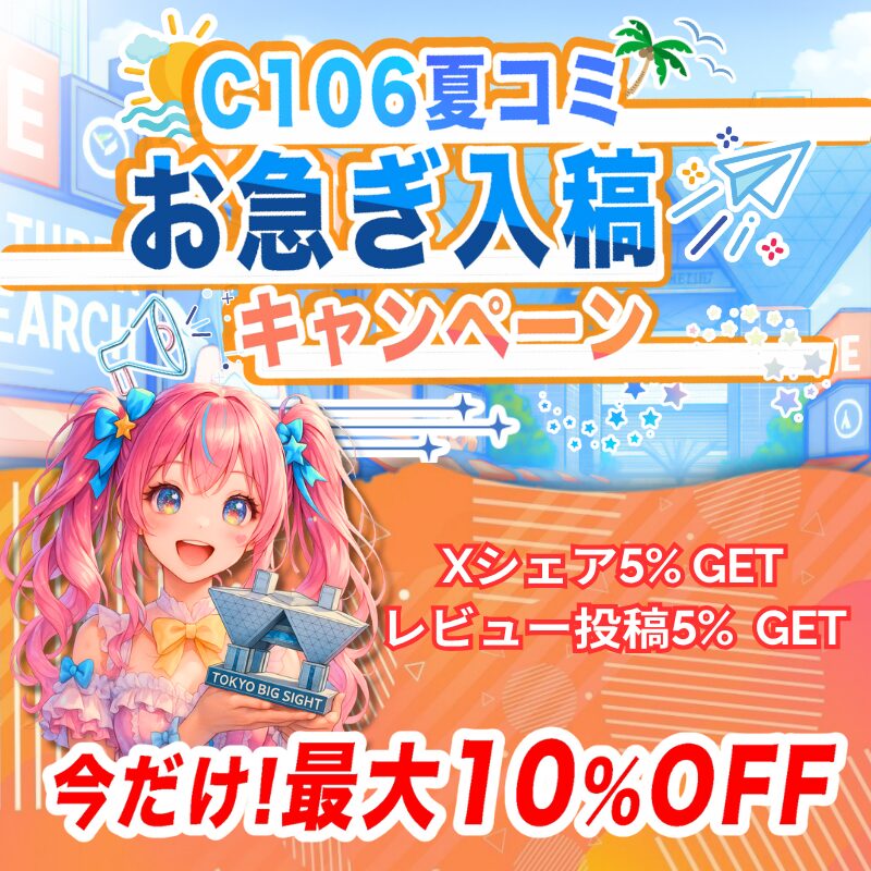 ご注文時に「会場搬入希望」とお知らせください。サークルスペース番号をご指定下さい。搬入は開催日の前日までに行います。会場の混雑状況により時間が前後する場合があります。